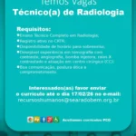 Interessado(a)s encaminhar currículo, mencionando no assunto: Vaga de Técnico(a) de Radiologia.